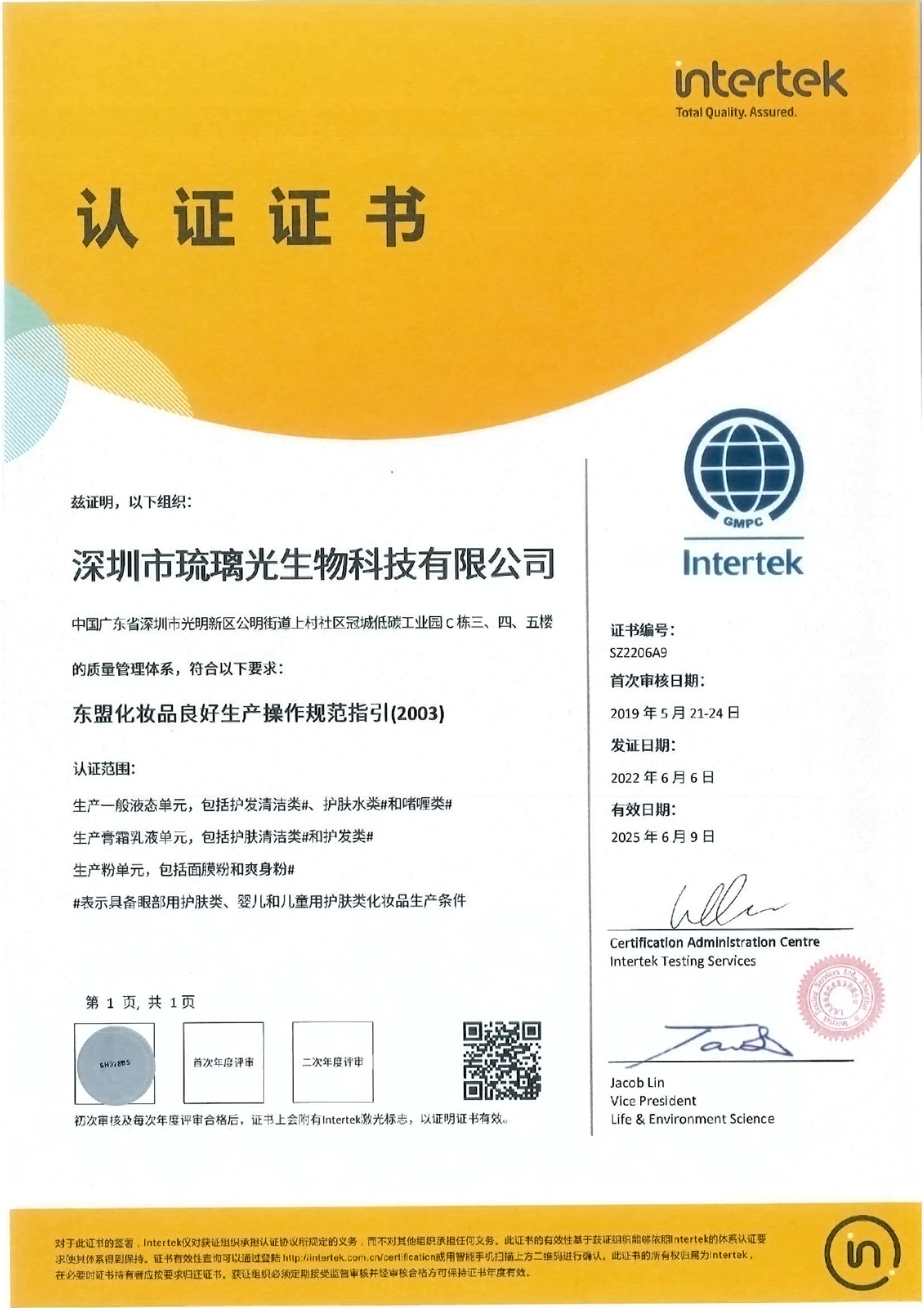 東盟GMPC認證證書中文SZ1906B5